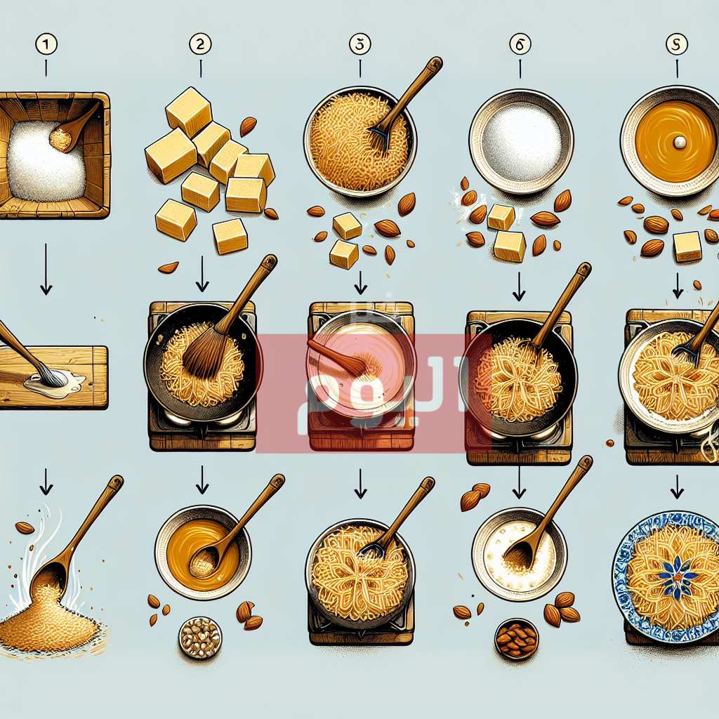 لتحضير هذا الحلى اللذيذ، ستحتاج إلى مكونات بسيطة ومتوفرة في معظم المتاجر والأسواق. ابدأي بتحميص الشعيرية في مقلاة على نار هادئة حتى تحمر قليلًا وتصبح ذهبية اللون. ثم قومي بإضافة السكر والزبدة واستمري في التحريك حتى تمتزج المكونات وتذوب السكر.